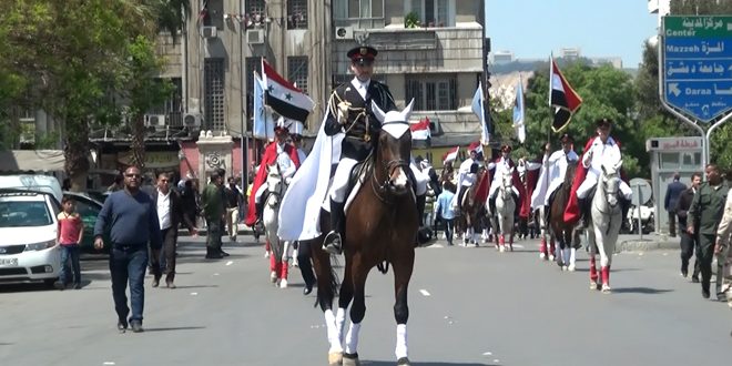 وتقدم المسيرة التي جالت معظم شوارع دمشق وساحاتها التاريخية كتيبة فرسان نادي الشرطة بالزي الرسمي ثم فرسان دمشق وريفها بالزي التراثي الأصيل ممتطين جيادا هي الأفضل مما وثقته كتب الأنساب العربية.