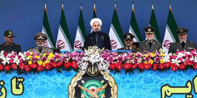 وأوضح روحاني أن “الاحتفال بيوم الجيش الإيراني يجسد إيثار وتضحيات جنوده خلال سنوات الدفاع عن وطنهم فيما هناك بعض الجيوش التي تذكرنا بالتدخل في الشؤون الداخلية للدول الأخرى والقتل والإبادة ودعم الإرهاب” مبينا أن الشعب في إيران يقف إلى جانب قواته المسلحة التي ستدافع عن المصالح الوطنية أينما وجدت وستبقى المدافع عن الشعب الإيراني.