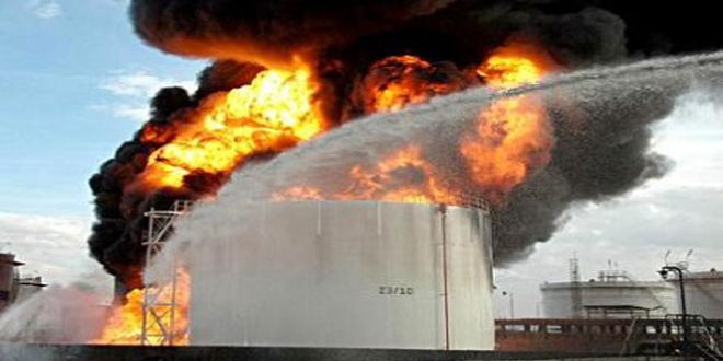 واندلعت عند الساعة السابعة من صباح اليوم النيران في الحوض الواقع قرب خزانات النفط في الجهة الشمالية لمديرية نقل النفط الثقيل.
