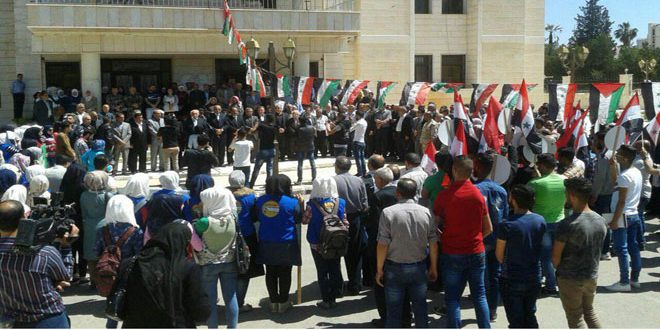 وقال المدرس سامر كزكز: “إن الوقفة استنكار للصمت الدولي أمام جرائم الارهاب المستمرة بحق أبناء الشعب السوري ورسالة للعالم أجمع بأن سورية ستظل قوية بقوة شعبها وعصية على الإرهاب والأعداء”.