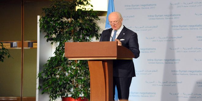 أكد المبعوث الخاص للأمين العام للأمم المتحدة إلى سورية ستافان دي ميستورا أن اجتماع الخبراء الذي عقد في طهران للدول الضامنة لمحادثات أستانا حول سورية والتي تضم ايران وروسيا وتركيا “عمل بشكل فعال لتعزيز اتفاق وقف الأعمال القتالية والتحضير لاجتماع أستانا المقبل”.