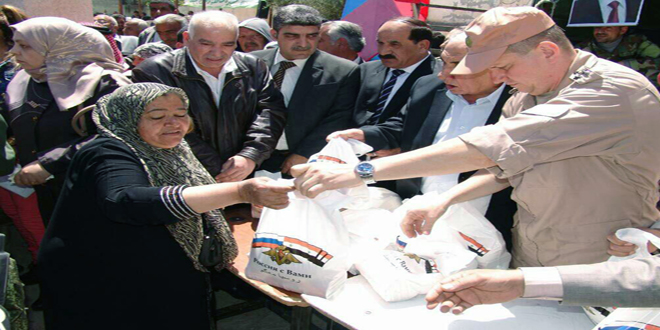 وقدمت روسيا خلال الفترات الماضية كميات كبيرة من المساعدات الإنسانية في عشرات البلدات بمختلف المحافظات السورية وقامت بتوزيعها بالتعاون والتنسيق مع الجهات المعنية في سورية لضمان وصولها إلى مستحقيها وعدم استيلاء الإرهابيين عليها ولا سيما أن المساعدات التي تحاول المنظمات الدولية إرسالها غالباً ما تستولي عليها التنظيمات الإرهابية.