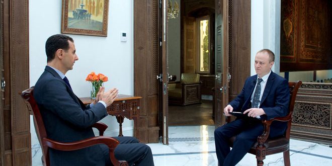 وقال الرئيس الأسد في مقابلة مع وكالتي ريا نوفوستي وسبوتنيك الروسيتين: إننا نعلن دائماً استعدادنا للتعاون مع أي بلد مستعد بصدق أو يريد أو لديه الإرادة لمحاربة الإرهاب، إننا لا نحدد أي بلدان تلك، نقول أي بلد بما في ذلك الغرب آخذين في الاعتبار معرفتنا المسبقة بأن الغرب يدعم الإرهابيين وأنه لا يمتلك الإرادة لمحاربتهم.