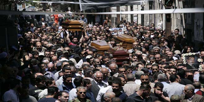 ولدى وصول جثامين الشهداء الخمسة حي باب توما حمل المشيعون النعوش وجالوا بها في شوارع الحي وصولا إلى كاتدرائية سيدة النياح البطريركية بحي باب شرقي بمشاركة رسمية وحزبية ورجال الدين الإسلامي والمسيحي وأعضاء مجلس الشعب وسط الهتافات التي تمجد معنى الشهادة في حين كانت الموسيقا تعزف اللحن الجنائزي.