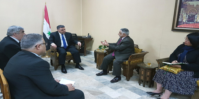 بحث وزير التربية الدكتور هزوان الوز مع مدير مكتب منظمة اليونيسكو الإقليمي ببيروت الدكتور حمد بن سيف الهمامي ما تم إنجازه في مدينة حلب والاحتياجات الأساسية اللازمة لمتابعة العملية التعليمية فيها وذلك بعد الزيارة الميدانية الأولى التي قام بها وفد مشترك من الوزارة واليونيسكو للمدينة.
