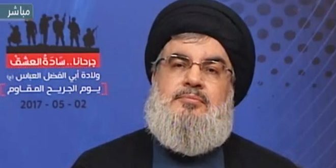 وقال نصر الله.. ” نحن أمام هذه الأحداث نزداد قناعة في كل يوم بأن خيار تدخلنا في سورية كان خيارا صحيحا وسليما وبوقته المناسب فكل لحظة تمر الآن في سورية هي لحظة نصر بمعنى أن الذين قاتلوا وصمدوا لم يسمحوا لهذه الجماعات الإرهابية أن تسقط الدولة وان تفكك الجيش ” موضحا أنه ليس نصرا نهائيا لكنه نصر عظيم صنعه أبناء سورية بقيادتها وجيشها وشعبها ومساعدة أصدقائها وحلفائها .