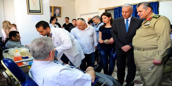 مدير الشركة العامة لتعبئة المياه المهندس رامز مرعي ومدير التخطيط في شركة اسمنت طرطوس المهندس علي علي أكدا أن العمال تبرعوا اليوم بدمائهم لجرحى الجيش وهم مستعدون لتقديم الغالي والنفيس في سبيل نصر سورية.