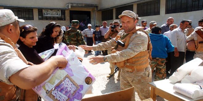 وتضمنت المساعدات مواد غذائية متنوعة من حبوب وسكر وشاي ومعلبات وحليب أطفال إضافة الى أغطية أسرة وجرى توزيعها بالتعاون مع لجنة أهلية ومختار القرية … وأكد ممثل مركز التنسيق الروسي العقيد فيتالي.. حرص روسيا الاتحادية على تقديم المساعدات الإنسانية والغذائية على العائلات المتضررة من الحرب الارهابية والحصار مشيرا الى ان المساعدات الروسية تشمل جميع المناطق والعائلات المتضررة.