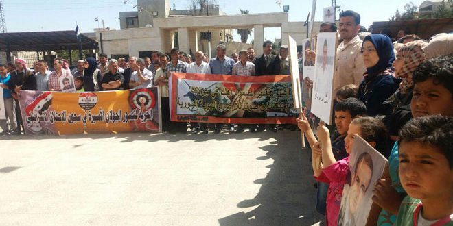 نظمت محافظة القنيطرة بالتعاون مع لجنة دعم الأسرى المحررين والمعتقلين في سجون الاحتلال الإسرائيلي اليوم وقفة احتجاجية على قرار سلطات الاحتلال الجائر بالحكم بالسجن 14 عاما بحق عميد الأسرى السوريين والعرب المناضل صدقى سليمان المقت المعتقل في سجون الاحتلال بعد تأجيل محاكمته عشرات المرات.