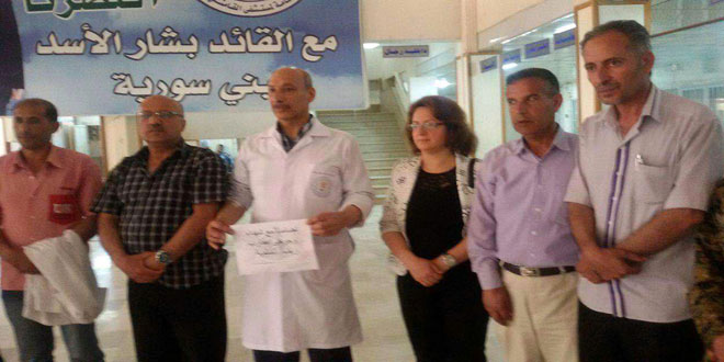 بمشاركة الفعاليات الأهلية نظمت الهيئة العامة لمشفى القامشلي الوطني بالحسكة اليوم وقفة تضامنية مع أسر وعائلات الشهداء والجرحى من ضحايا المجزرة التي ارتكبها تنظيم “داعش” الإرهابي بحق أهالي قرية عقارب الصافية شرق مدينة سلمية.