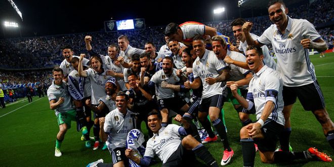 توج ريا ل مدريد بطلا للدوري الإسباني بكرة القدم للمرة الأولى منذ عام 2012 بعد فوزه على مضيفه ملقا بهدفين دون مقابل.