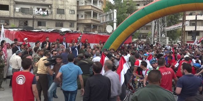 احتفالا بفتح طريق مدينتي التل ومنين في محافظة ريف دمشق تم إطلاق سباق للدراجات خلال مهرجان جماهيري شعبي واسع شاركت فيه مختلف الفعاليات الاقتصادية والثقافية والرياضية في المحافظة.