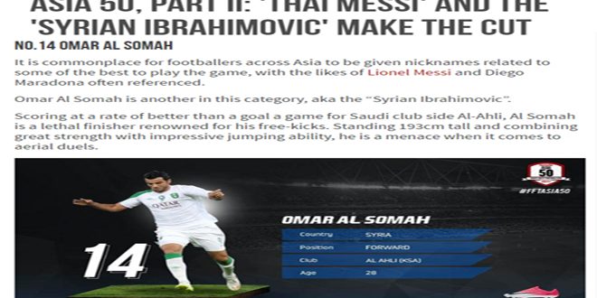 اختارت مجلة “فور فور تو” البريطانية لاعب منتخب سورية لكرة القدم المحترف في الأهلي السعودي عمر السومة ضمن أبرز النجوم الذين لفتوا الأنظار هذا الموسم في قارة آسيا.