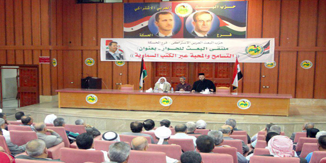 أقامت قيادة فرع حزب البعث العربي الاشتراكي في محافظة الحسكة ملتقى البعث الحواري بعنوان “التسامح والمحبة في الديانات السماوية”.