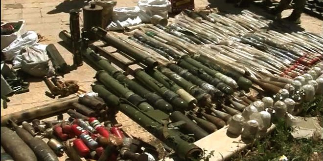 وذكر مراسل سانا في حمص أن عناصر الهندسة ضبطوا اليوم داخل مقرات التنظيمات الإرهابية في حي الوعر صواريخ متنوعة /ب10/ وصواريخ لاو وصاروخ كوبرا وصواريخ كاتيوشا وحشوات وقذائف /ار بي جي/.