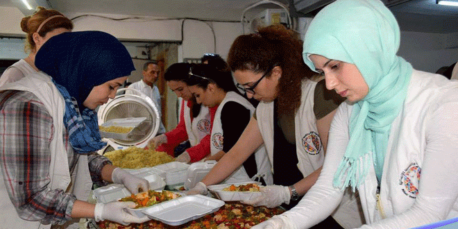 عشرات المتطوعين من الفريقين يقضون أكثر من تسع ساعات في المطبخ ليقوم قسم آخر بالتواجد صباحا ومساء ضمن مول “الهاى مارت” في اللاذقية لجمع التبرعات العينية اللازمة لكل وجبة.