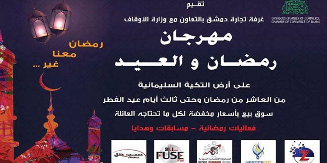 بمشاركة نحو 60 شركة تجارية متخصصة بالمنتجات الغذائية والنسيجية والمنظفات والعطورات تنطلق رسميا غدا الثلاثاء فعاليات مهرجان “رمضان والعيد” في التكية السليمانية بدمشق.