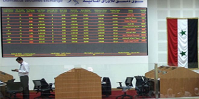 ارتفع مؤشر سوق دمشق للأوراق المالية نتيجة جلسة تداولات اليوم 08ر1 نقطة عن الجلسة الماضية ليغلق على قيمة 36ر2938 نقطة وبنسبة تغير موجبة قدرها 04ر0 بالمئة مع حجم تداول قدره 26707 أسهم موزعة على 73 صفقة بقيمة تداولات إجمالية بلغت 478ر9 ملايين ليرة.