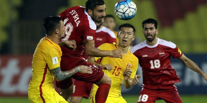 تعادل منتخب سورية بكرة القدم مع نظيره الصيني بهدفين لمثلهما في المباراة التي جرت اليوم على ملعب هانغ جيبات في مدينة ملاكا الماليزية ضمن الجولة الثامنة من الدور النهائي لتصفيات آسيا المؤهلة لكأس العالم في روسيا 2018.