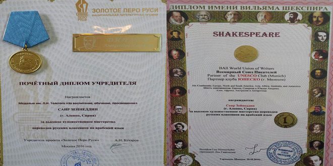 وكانت لجنة المسابقة الأدبية الدولية في روسيا المعروفة باسم جائزة الريشة الذهبية منحت الكاتب والمترجم السوري ثائر زين الدين جائزتين أدبيتين لعام 2016 تقديرا للمستوى الفني الرفيع لترجماته لأعمال الكلاسيكيين الروس إلى اللغة العربية.
