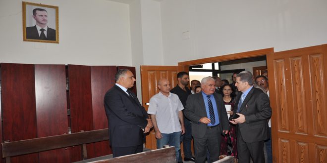 تفقد وزير العدل القاضي هشام الشعار أعمال التأهيل والترميم الجارية لقصر العدل في حي الوعر بحمص حيث اطلع على حجم الأضرار التي لحقت بالقصر ومكاتبه نتيجة الأعمال الإرهابية التي ارتكبتها المجموعات المسلحة.