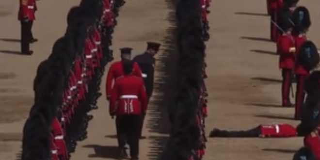 ويظهر مقطع فيديو، سقوط أحد الحراس أثناء عزف الموسيقى، وتدخل جنود آخرون لإخراجه على نقالة.