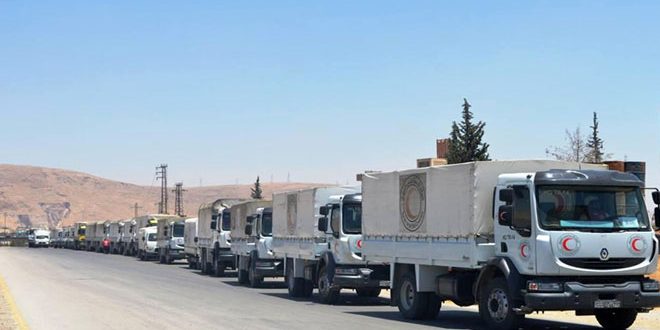 وأفاد الهلال الأحمر في بيان نشره على صفحته في الفيسبوك بأنه تمكن بالتعاون مع اللجنة الدولية للصليب الأحمر ومكاتب الأمم المتحدة من “إدخال قافلة المساعدات الإنسانية التي كانت من المفترض أن تصل حرستا ومديرا ومسرابا بريف دمشق منذ يومين” .