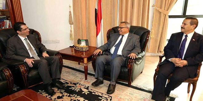 بحث رئيس مجلس الوزراء اليمني الدكتور عبد العزيز صالح بن حبتور مع القائم بأعمال السفارة السورية في اليمن الحكم دندي في صنعاء علاقات التعاون بين البلدين وسبل تعزيزها لصالح الشعبين الشقيقين.