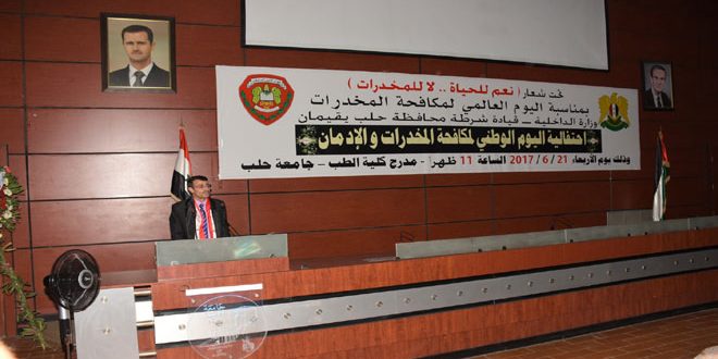 بمناسبة اليوم العالمي لمكافحة المخدرات أقامت وزارة الداخلية بالتعاون مع قيادة شرطة محافظة حلب اليوم فعالية بعنوان “اليوم الوطني لمكافحة المخدرات والإدمان” وذلك على مدرج كلية الطب بجامعة حلب.