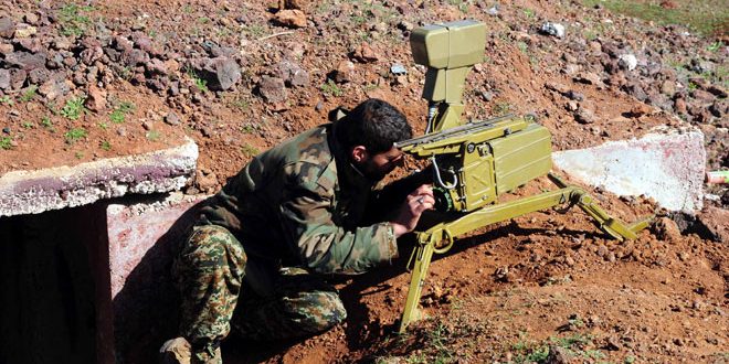 وأوقعت وحدات من الجيش أمس عشرات القتلى بين إرهابيي تنظيم جبهة النصرة ودمرت لهم قاعدة إطلاق صواريخ مضادة للدروع في قرية مليحة العطش ومنطقة درعا البلد وفي تلول سلمان بريف السويداء الشمالي الشرقي.