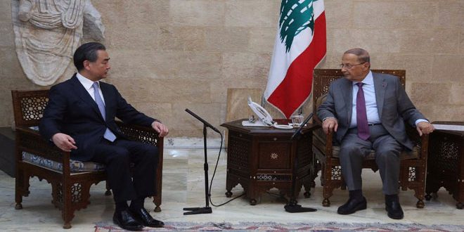 وعرض عون خلال لقائه وزير الخارجية الصيني وانغ يي في بيروت اليوم مواقف لبنان من التطورات الإقليمية الراهنة.