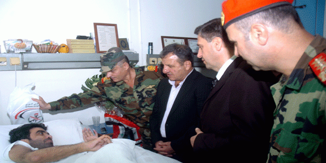 ونوه المحافظ في تصريح صحفي عقب التكريم اليوم “بصمود القوات المسلحة التي تحارب الإرهاب التكفيري أينما وجد على مساحة الجغرافية السورية حتى دحره عن تراب الوطن ليبقى حرا كريما عزيزا شامخا” مؤكدا ان “جرحى الجيش هم اليوم أكثر تصميما على العودة إلى ساحات الوغى بعد شفائهم لسحق الإرهابيين وإعادة الأمن والأمان”.