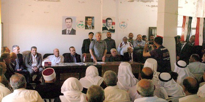 وأكد الأهالي خلال اللقاء ” وقوفهم الى جانب الجيش العربي السوري في حربه ضد الإرهاب وداعميه وكل المؤامرات التي تستهدفه مجددين ثقتهم بحماة الوطن ودورهم البطولي في الدفاع عنه والحفاظ على وحدة ترابه وأمنه وصد أي عدوان همجي يتعرض له”.