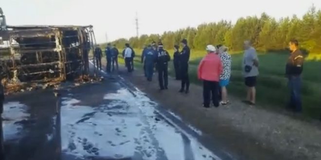 ونقلت نوفوستي عن المديرية الإقليمية لوزارة الطوارئ الروسية قولها في بيان إن “شاحنة لنقل المحروقات اصطدمت مع حافلة ركاب ما أدى لانقلاب الأخيرة واشتعال النار فيها على مسافة تسعة كيلومترات من مدينة زاينسك”.