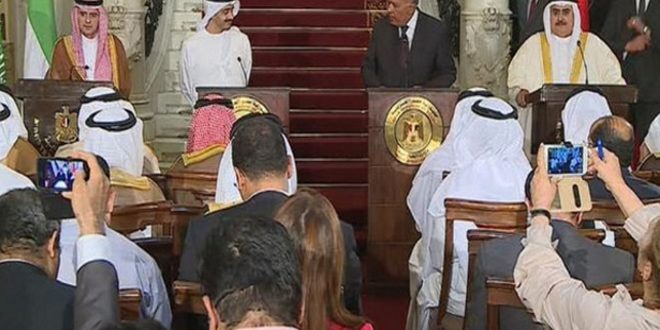 وصدر بيان مشترك في ختام الاجتماع تلاه وزير الخارجية المصري سامح شكري أكد فيه وزراء الدول الأربع المجتمعون أنهم اتفقوا على متابعة الموقف وعقد اجتماعهم المقبل في المنامة.