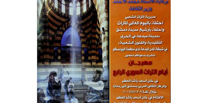 يفتتح عند الساعة الثانية عشرة من ظهر يوم الأحد المقبل فعاليات أيام التراث السوري الرابع التي تقيمها مديرية التراث الشعبي في وزارة الثقافة وذلك في خان أسعد باشا العظم والمركز الثقافي العربي في أبو رمانة.