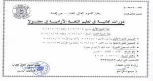 وبين الدكتور نايف الياسين عميد المعهد في تصريح لـ سانا اليوم أن الدورة ستبدأ في السادس عشر من الشهر الجاري وتستمر لغاية التاسع من شهر آب المقبل بمعدل ثلاثة أيام في الأسبوع ولمدة ساعتين يوميا من الساعة 4 وحتى 6 مشيرا إلى أن التسجيل فيها سيبدأ الأحد القادم ولغاية 13 من الشهر الجاري.