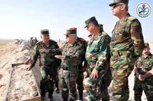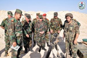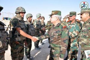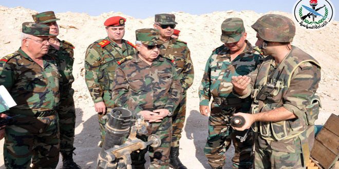 واستمع رئيس هيئة الأركان من القادة الميدانيين إلى شرح مفصل عن طبيعة المهام القتالية التي نفذتها القوات ودقق خطط العمليات المقبلة وزودهم بتوجيهاته مشيرا الى أن المشروع الإرهابي “يتداعى وينهار بفضل صمود شعبنا الأبي والتفافه حول جيشه الباسل وقيادته الحكيمة والشجاعة بقيادة الرئيس الأسد”.