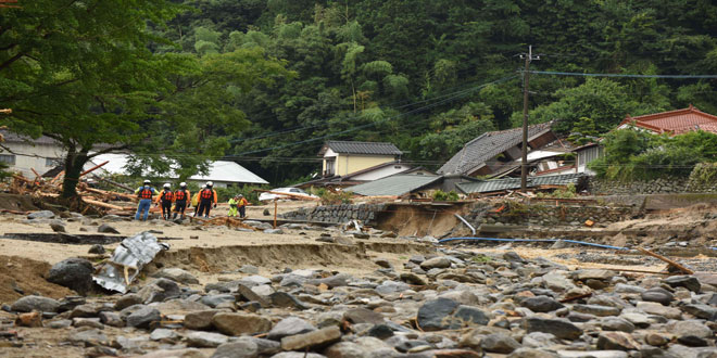 وتسببت أمطار غزيرة غير مسبوقة بفيضان الأنهر عن ضفافها لتجرف معها طرقا ومنازل ومدارس في منطقة واسعة من جزيرة كيوشو أقصى الجنوب واحدى الجزر الرئيسية الأربع لأرخبيل اليابان على بعد نحو 900 كلم من العاصمة طوكيو.