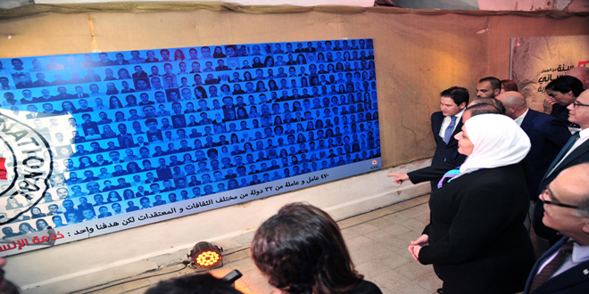 وعن المعرض تبين صدقي أنه “تضمن لوحتين تعرض الأولى صورا للعاملين في اللجنة ضمن سورية وهم نحو 500 عامل من جنسيات مختلفة بينما تحمل الثانية أسماء شهداء منظمة الهلال الأحمر العربي السوري الذين خسروا حياتهم أثناء عملهم الإنساني”.