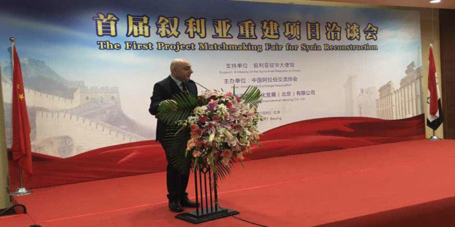 وتحدث السفير السوري في بكين الدكتور عماد مصطفى في كلمته أمس إلى المستثمرين وممثلي الشركات عن فرص الاستثمار في سورية والدور الكبير المنتظر للشركات الصينية في مرحلة اعادة الاعمار في سورية بعد انتهاء الأزمة فيها مبينا أن الحكومة السورية ستعطي الشركات الصينية الأولوية في فرص الاستثمار واعادة الاعمار.