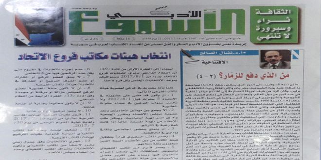 حفل العدد الجديد من جريدة الأسبوع الأدبي الصادرة عن اتحاد الكتاب العرب بدراسات أدبية وقراءات نقدية ورؤى سياسية فضلا عن أخبار الثقافة والأدب بينما حازت القصائد الشعرية والقصص القصيرة على حيز أكبر من المعتاد.