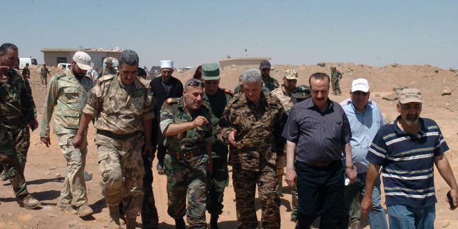 واستمع المحافظ لشرح من القادة الميدانيين عن سير الأعمال القتالية لبسط السيطرة على مساحات واسعة من البادية ومحاصرة الإرهابيين فيها والقضاء عليهم وقطع خطوط إمدادهم من الحدود الأردنية باتجاه الداخل وغوطة دمشق الشرقية وإفشال المخططات العدوانية للدول المتآمرة .