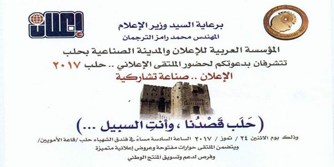 تستضيف محافظة حلب غدا فعاليات الملتقى الإعلاني “الإعلان … صناعة تشاركية” الذي تقيمه المؤسسة العربية للإعلان بالتعاون مع المدينة الصناعية بالشيخ نجار وذلك في فندق شهباء حلب تحت شعار “حلب قصدنا وأنت السبيل”.