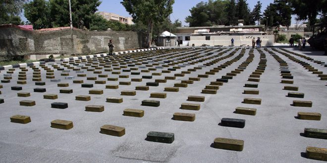 وضبطت الجهات المختصة في أيار الماضي 4 سيارات تحمل كميات كبيرة من الأسلحة والذخائر كانت متجهة من المنطقة الجنوبية إلى تنظيم جبهة النصرة الإرهابي في الغوطة الشرقية.