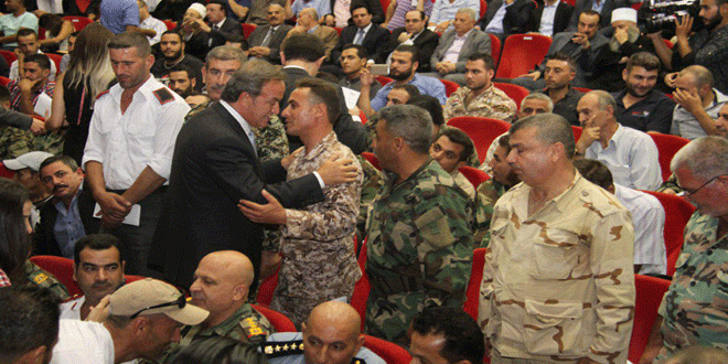 بدوره أشار رئيس فرع الأمن العسكري بالسويداء العميد الدكتور وفيق ناصر إلى أن “الوقوف أمام القامات الشامخة من ذوي الشهداء والجرحى موقف مشرف فهم خير خلف لخير سلف من أجدادنا الذين قاتلوا المستعمرين لتبقى سورية موحدة لافتاً إلى أن أبطال الجيش العربي السوري اليوم يتصدون لعدو الأمس الذي جاء بوجه جديد هو الوجه الإرهابي”.