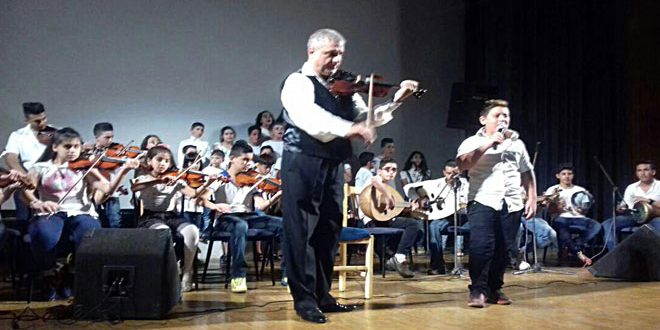 وخلال الحفل الذي استضافه المركز الثقافي العربي بمدينة حمص صدح كل من الأطفال موسى عربش واديل مرة ويوسف اسكاف بأغان طربية ووطنية منها يا شادي الألحان وع العين موليتين وجبل ماجبل وذلك على ايقاع الآلات الشرقية والغربية من عود وبزق وغيتار وأورغ وكمنجات.