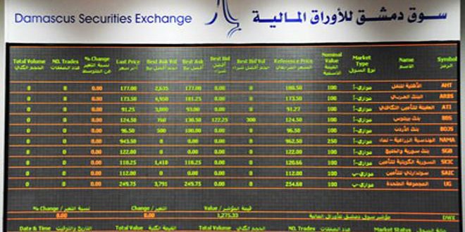أغلقت جلسة تداولات سوق دمشق للأوراق المالية اليوم على حجم تداول قدره111852 سهما موزعة على 100 صفقة بقيمة تداولات إجمالية بلغت 124ر36 مليون ليرة وانخفض مؤءشر السوق 30ر16 نقطة عن الجلسة الماضية حيث أغلق على قيمة 98ر2917 نقطة وبنسبة تغير سالبة قدرها 56ر0 بالمئة.