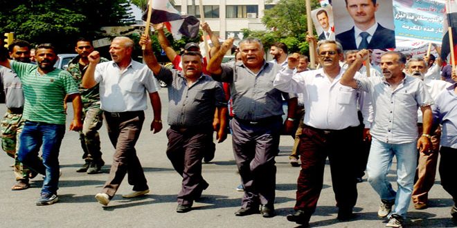 شارك المئات من أبناء قرى ريف اللاذقية الشمالي المحررة من الإرهاب بوقفة تضامنية اليوم في ساحة المحافظة بمدينة اللاذقية تقديرا للتضحيات التي يقدمها الجيش العربي السوري وللجهود المبذولة في إعادة إعمار بيوتهم والمؤسسات العامة واستصلاح الأراضي في قراهم التي دمرها الإرهاب.