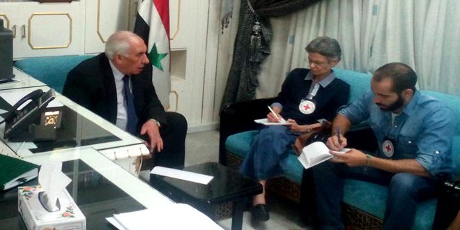 بحث محافظ درعا محمد خالد الهنوس مع رئيسة بعثة اللجنة الدولية للصليب الأحمر في سورية ماريان غاسر واقع المشاريع المشتركة وكيفية تطوير عمليات الاستجابة الخاصة بمياه الشرب والكهرباء والإغاثة والصرف الصحي.